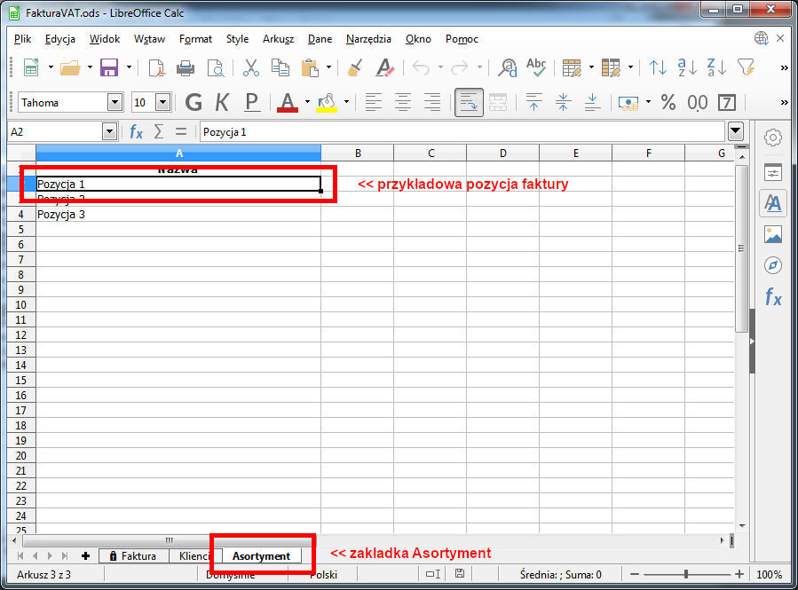 Następnie trzeba wprowadzić pozycje asortymentu. Należy wybrać zakładkę Asortyment u dołu arkusza i wprowadzić opisy oferowanych produktów oraz usług. Nowych pozycje dodaje się w miarę potrzeby. Proszę pamiętać, że nie ma konieczności odblokowywanie arkusza w celu wykonania tej operacji