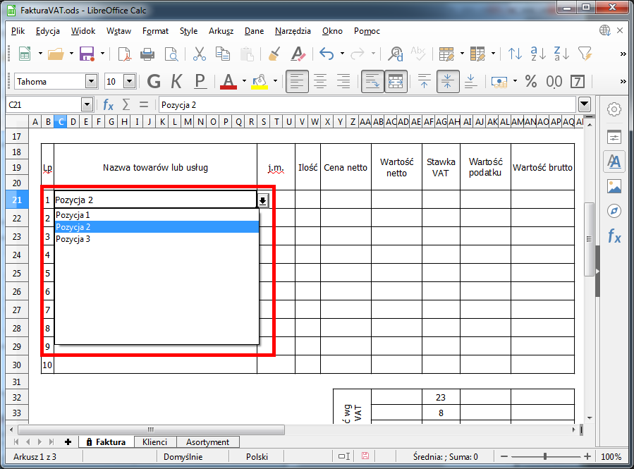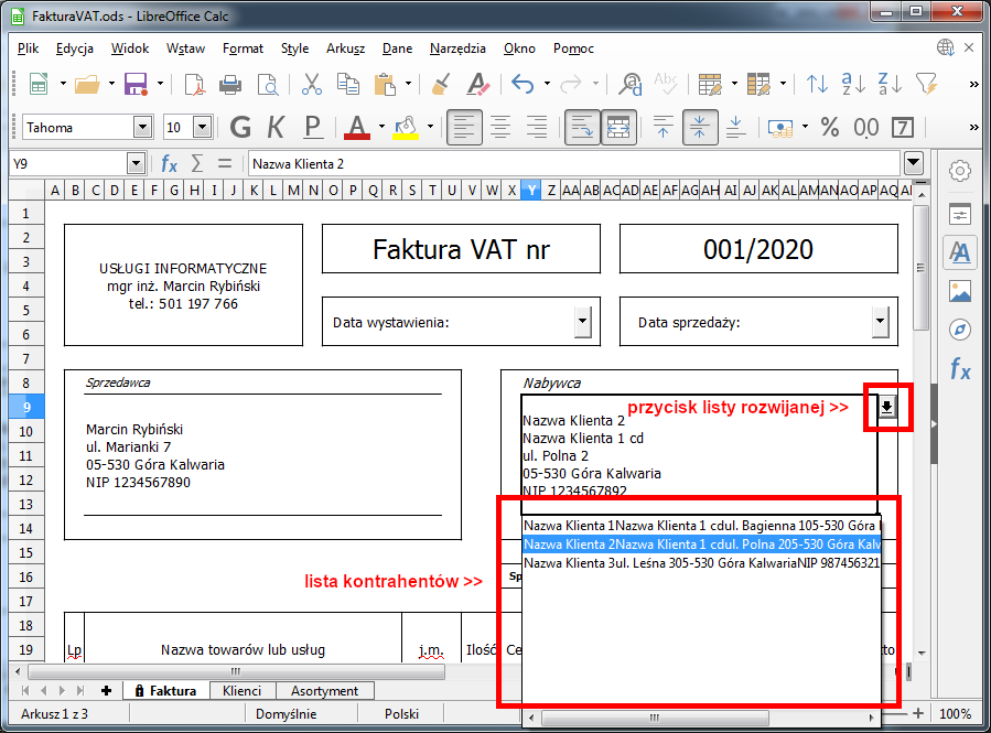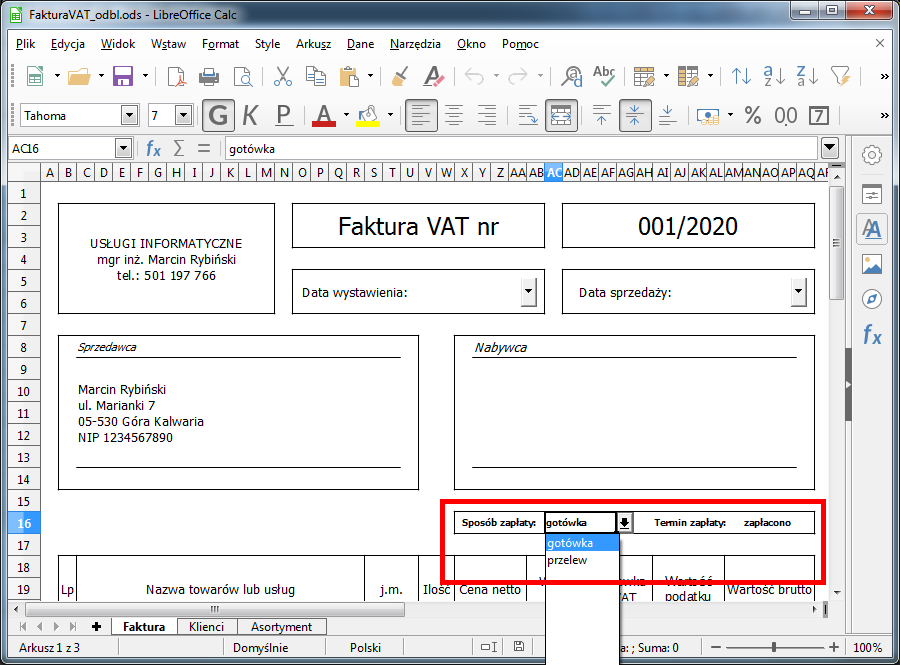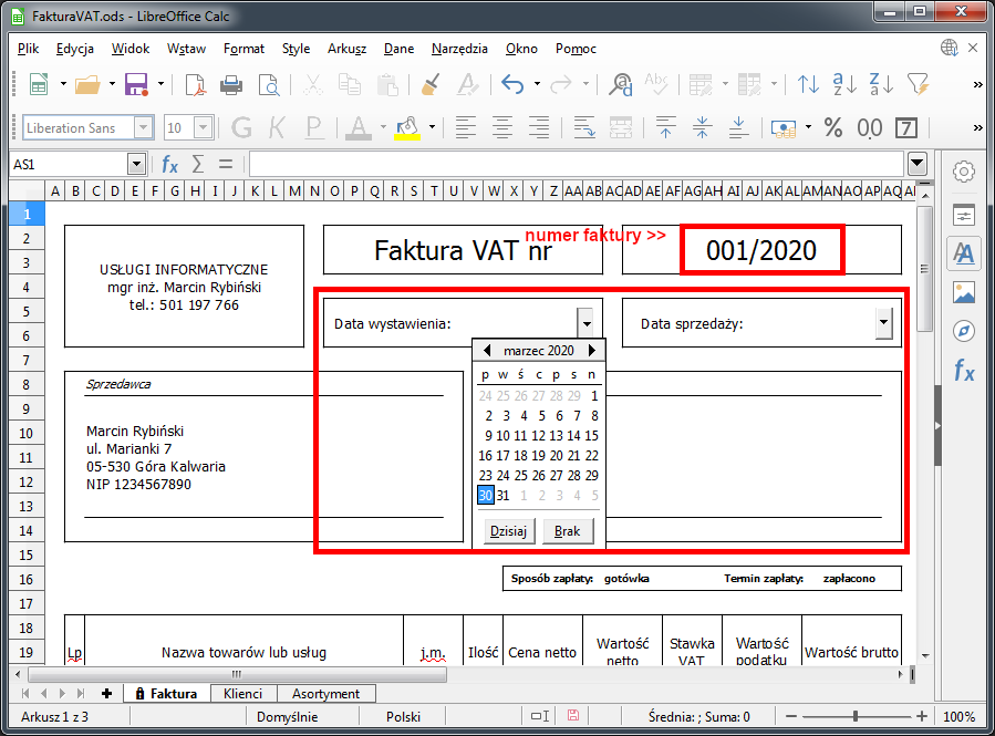 Zapraszam do skorzystania ze stworzonego przez mnie szablonu faktury. Szablon jest całkowie darmowy i umożliwia wystawianie faktur z wykorzystaniem wewnętrznych baz kontrachentów oraz asortymentu. Do otwarcia szablonu niezbędna jest instalacja darmowego programu LibreOffice.