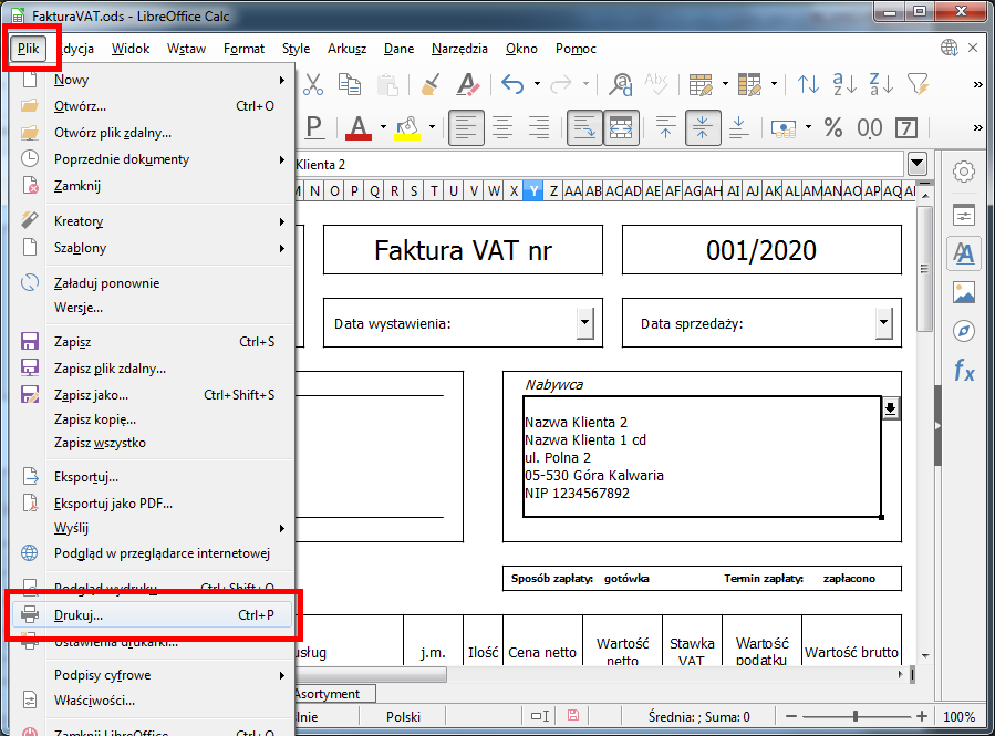 W celu wydruku faktury należy wybrać z menu Plik opcji Drukuj