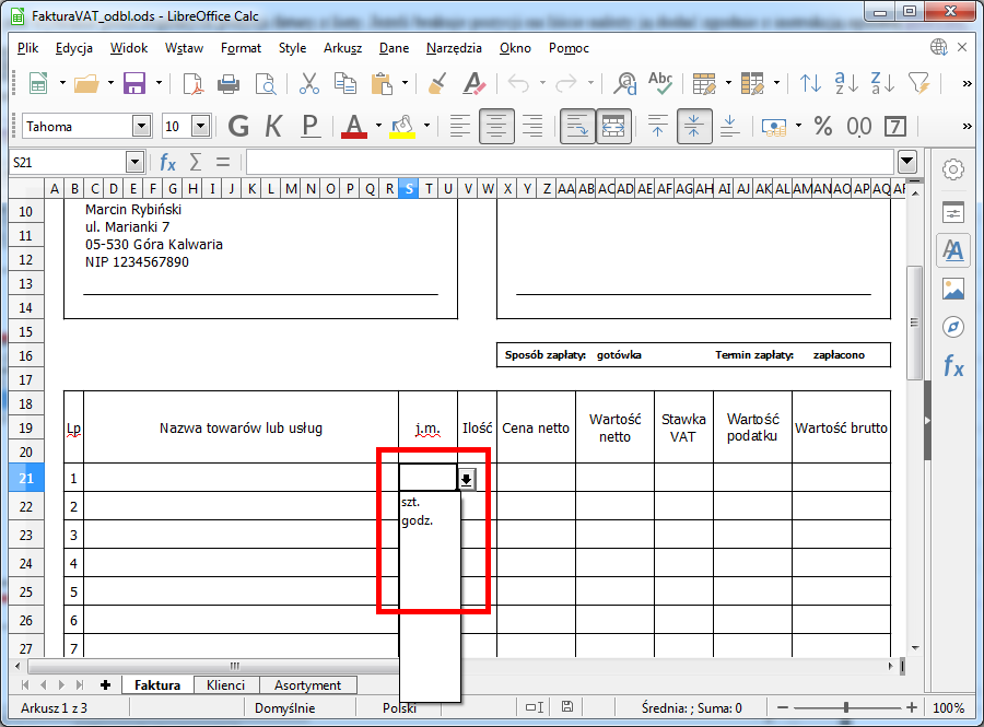 Po otwarciu pliku szablonu za pomocą programu LibreOffice Calc należy wpisać w odpowiednie pola dane swojej firmy. Operację tę wykonuje się jednorazowo przed pierwszym użyciem szablonu.