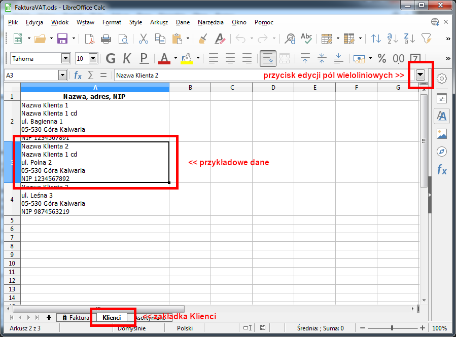Teraz można zacząć korzystać z szablonu. Na początek trzeba zasilić danymi bazę kontrahentów. Należy wybrać zakładkę Klienci u dołu arkusza i wprowadzić dane swoich kontrachentów. Edycję pól wieloliniowych umożliwia sprecjalny przycisk w prawym górnym rogu okna. Nowych klientów dodaje się w miarę potrzeby. Proszę pamiętać, że nie ma konieczności odblokowywanie arkusza w celu wykonania tej operacji