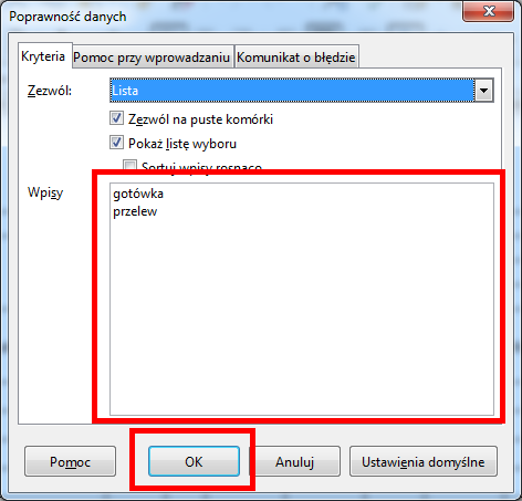 Następnie w okienku Poprawność danych w polu Wpisy dodać nowe pozycje. Zapisać zmiany kliknięciem przycisku OK.