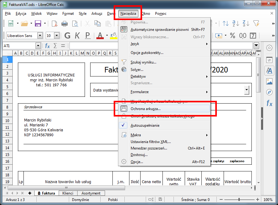 Przed przystąpieniem do edycji należy jednak odblokować do edycji wszystkie pola arkusza Faktura. W trybie normalnej pracy pola te powinny pozostawać zablokowane, aby uniknąc ich przypadkowej zmiany. Wybieramy z menu Narzędzia -> Ochrona arkusza. Arkusz nie jest zabezpieczony hasłem więc jego odblokowanie nastąpi od razu.