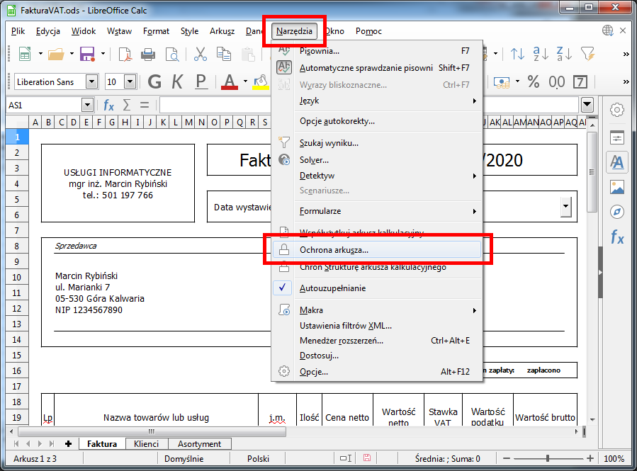 Po zakończeniu edycji dnych firmy należy koniecznie ponownie zabezpieczyć arkusz. Wybieramy z menu Narzędzia -> Ochrona arkusza.
