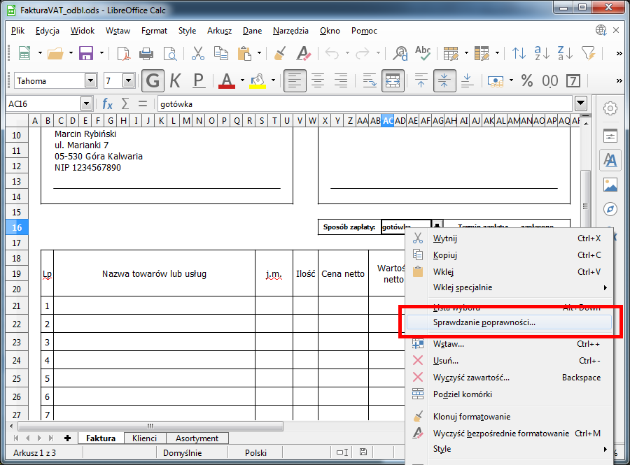 Jeśli jest taka potrzeba można dodać dodatkowe pozycje w polach Sposób zapłaty oraz Termin zapłaty. W tym celu należy klknąć prawym przyciskiem myszy na danym polu i wybrać z menu konterkstowego Sprawdzanie poprawności.