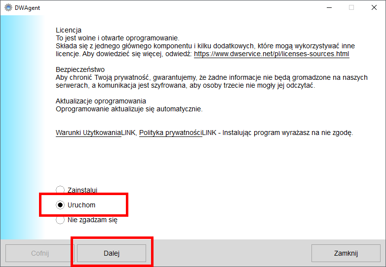 Po uruchomieniu programu DWAgent naeży wybrać opcję Uruchom, a następnie kliknąć przycisk Dalej