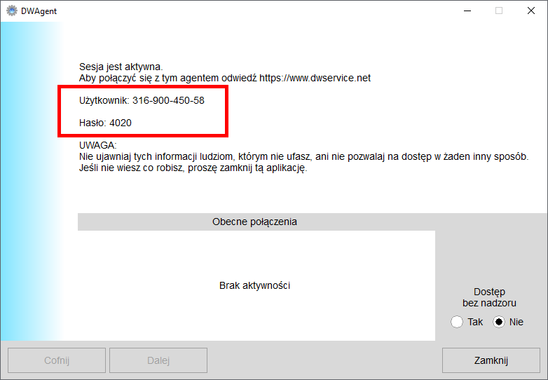 Aby skorzystać z pomocy online należy pobrać, a następnie uruchomić darmowy program DWAgent.